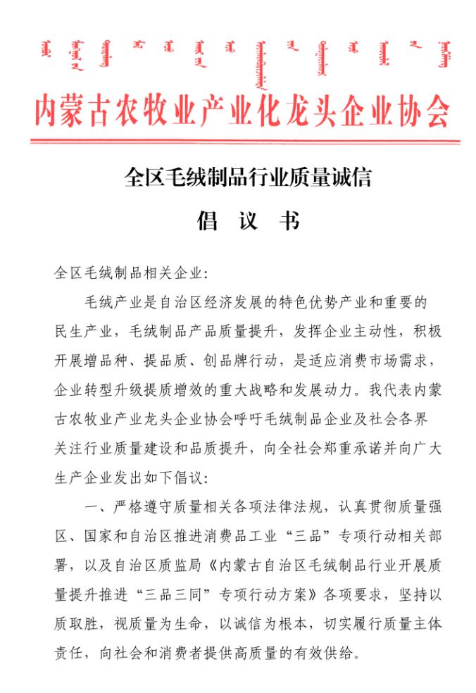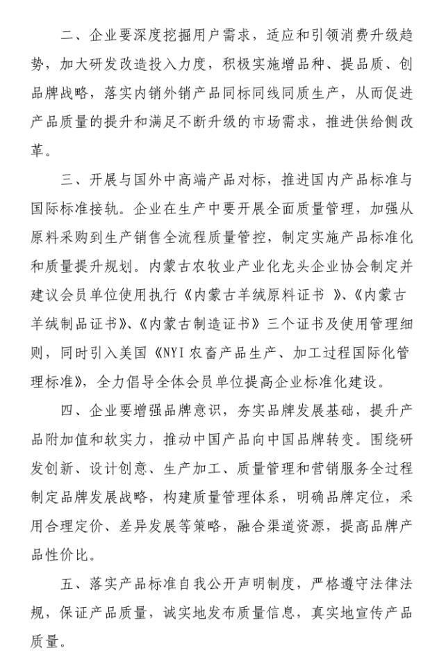 會(huì)上,質(zhì)監(jiān)局質(zhì)量監(jiān)督處副處長艾繼青宣讀國務(wù)院辦公廳《關(guān)于開展消費(fèi)品工業(yè)“三品”專項(xiàng)行動(dòng)營造良好市場(chǎng)環(huán)境的若干意見》;孫磐處長向與會(huì)人員通報(bào)了近年羊絨監(jiān)督抽查的質(zhì)量狀況基本情況,并傳達(dá)了內(nèi)蒙古質(zhì)監(jiān)局印發(fā)的毛絨制品行業(yè)質(zhì)量提升推進(jìn)“三品三同”專項(xiàng)行動(dòng)方案;纖維檢驗(yàn)局總工程師曹渭芳介紹了纖檢局助力企業(yè)產(chǎn)品質(zhì)量提升檢驗(yàn)?zāi)芰Φ姆?wù)舉措;協(xié)會(huì)副會(huì)長、羊絨分會(huì)名譽(yù)會(huì)長單位鄂爾多斯羊絨集團(tuán),協(xié)會(huì)副會(huì)長、內(nèi)蒙古鹿王羊絨制品有限公司及內(nèi)蒙古豐蒂妮羊絨制品有限公司三家企業(yè)相關(guān)負(fù)責(zé)人介紹了各自企業(yè)在落實(shí)國家和自治區(qū)羊絨產(chǎn)業(yè)政策、加快企業(yè)轉(zhuǎn)型升級(jí)和產(chǎn)品質(zhì)量提升方面的先進(jìn)經(jīng)驗(yàn);內(nèi)蒙古農(nóng)牧業(yè)產(chǎn)業(yè)化龍頭企業(yè)協(xié)會(huì)常務(wù)秘書長劉俊青代表行業(yè)協(xié)會(huì)向全區(qū)毛絨制品相關(guān)企業(yè)發(fā)起全區(qū)毛絨制品行業(yè)誠信倡議書,呼吁毛絨制品企業(yè)從質(zhì)量和誠信入手,提升產(chǎn)品品質(zhì),提升企業(yè)核心競(jìng)爭(zhēng)力,認(rèn)真履行責(zé)任,共同推進(jìn)行業(yè)整體利益和健康發(fā)展。