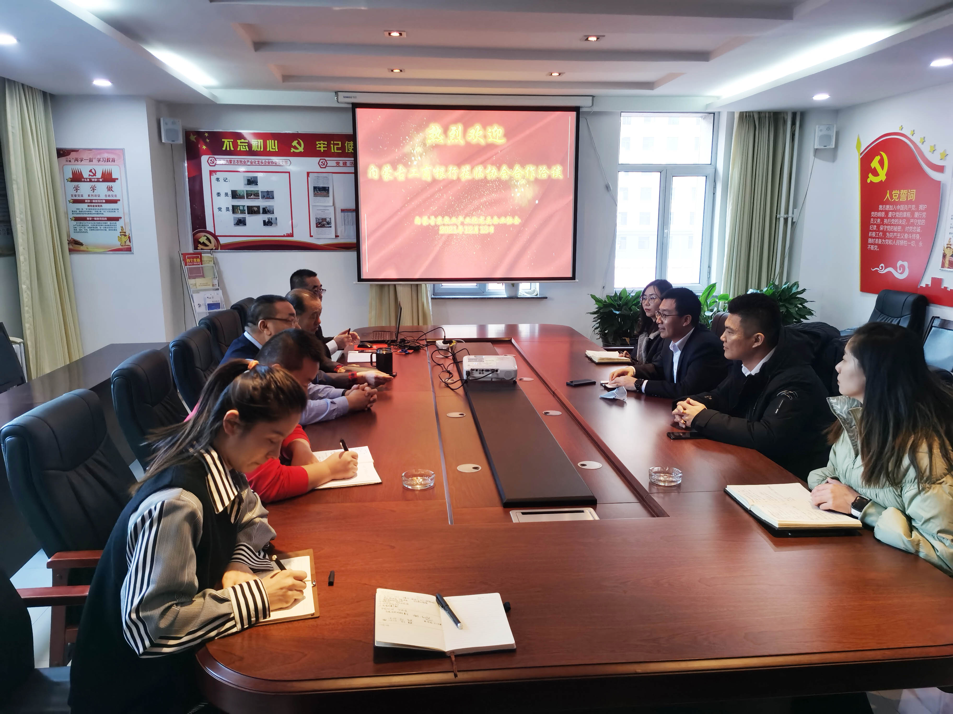 2021年12月13日,工商銀行內(nèi)蒙古分行普惠金融事業(yè)部總經(jīng)理(鄉(xiāng)村振興辦公室主任)王清亮一行5人到內(nèi)蒙古農(nóng)牧業(yè)產(chǎn)業(yè)化龍頭企業(yè)協(xié)會進行合作洽談,協(xié)會會長周勇、執(zhí)行會長林永亮、執(zhí)行秘書長呼群等參加會議。