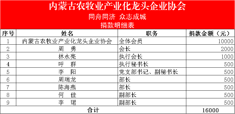三、“一方有難,八方支援”,截止目前,在協(xié)會(huì)會(huì)長(zhǎng)周勇的帶領(lǐng)下,協(xié)會(huì)秘書處共募集抗疫捐款1.6萬(wàn)元,結(jié)合地方所需,已于2月23日以現(xiàn)款形式捐贈(zèng)給呼和浩特市紅十字會(huì),用于呼和浩特市疫情防控工作。