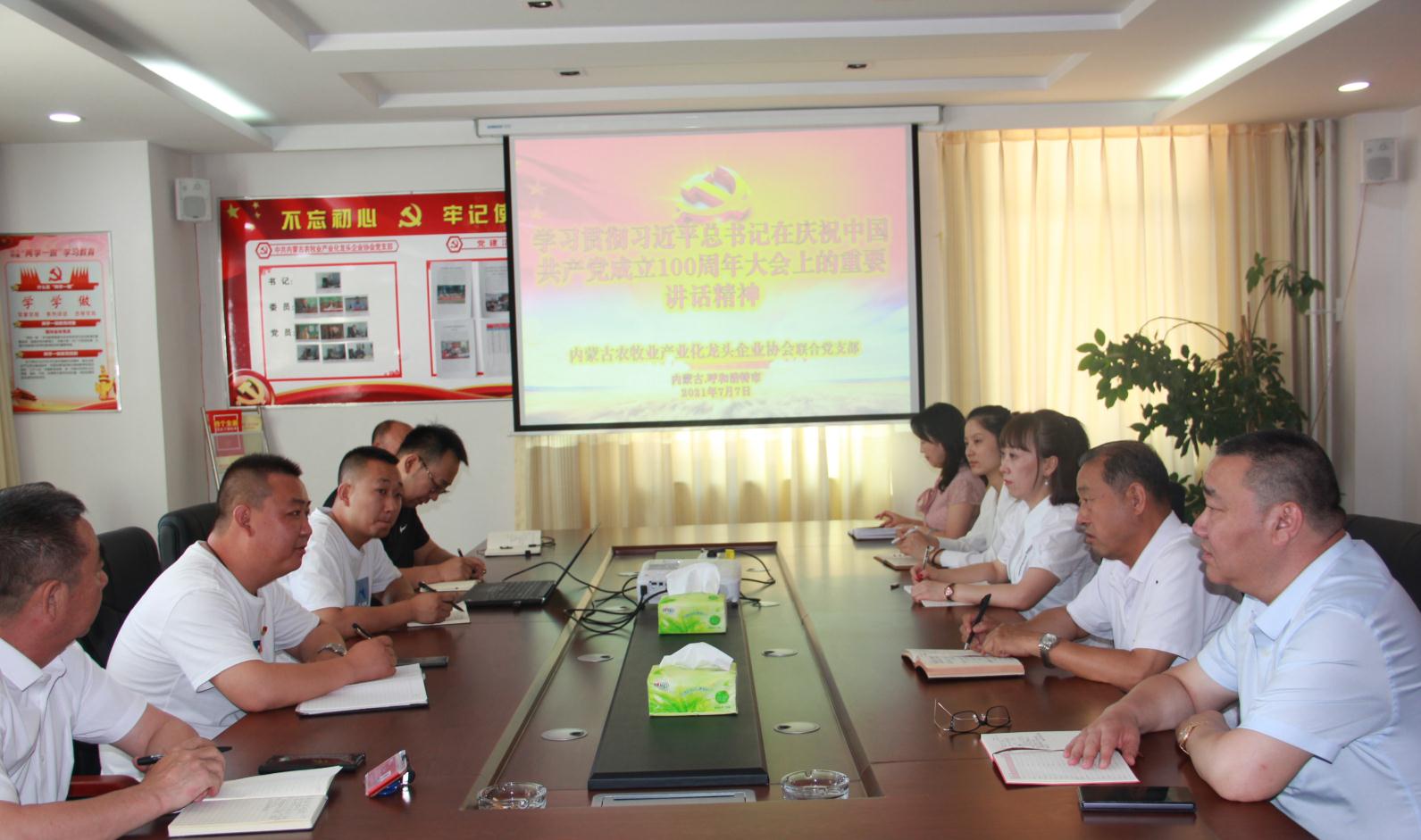 2021年7月7日上午,內(nèi)蒙古農(nóng)牧業(yè)產(chǎn)業(yè)化龍頭企業(yè)協(xié)會聯(lián)合黨支部書記李陽主持召開“學(xué)習(xí)貫徹習(xí)近平總書記在慶祝中國共產(chǎn)黨成立100周年大會上的重要講話精神”座談會。協(xié)會會長周勇,執(zhí)行會長林永亮,執(zhí)行秘書長呼群等所有在呼黨員干部參加會議。