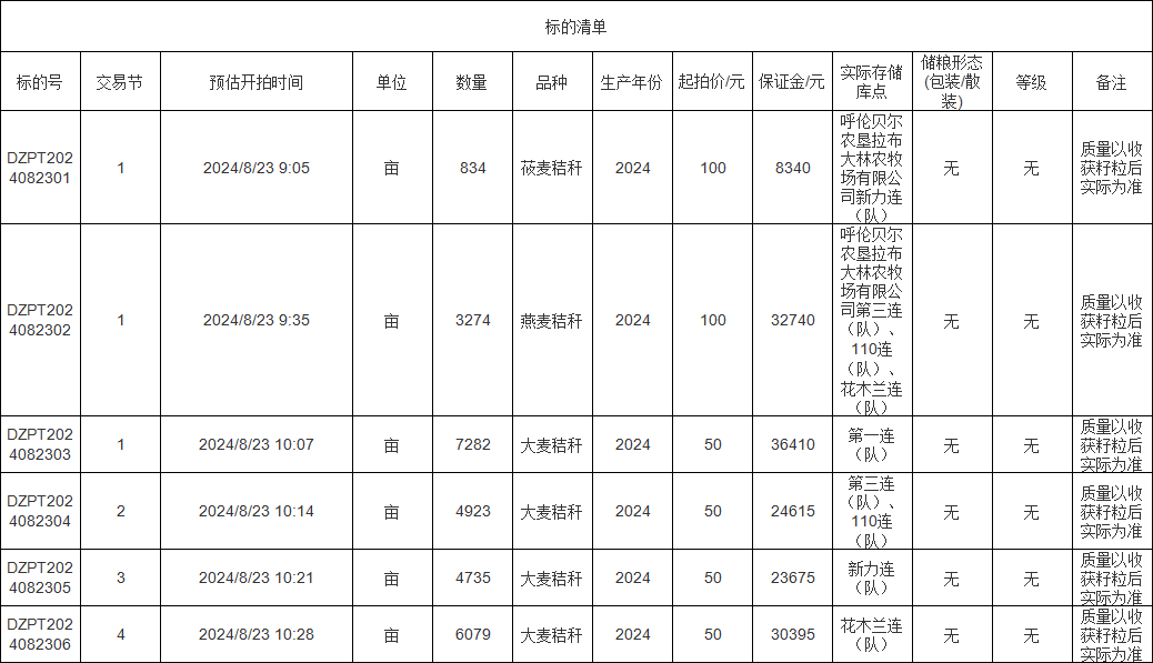 轉(zhuǎn)讓標(biāo)的為莜麥秸稈、燕麥秸稈、大麥秸稈,涉及面積莜麥秸稈834畝、燕麥秸稈3274畝、大麥秸稈(1-4標(biāo))分別為7282畝、4923畝、4735畝、6079畝,意向受讓方在競(jìng)買前應(yīng)自行對(duì)標(biāo)的預(yù)估數(shù)量和質(zhì)量情況進(jìn)行充分了解,交易標(biāo)的均以實(shí)際狀況為準(zhǔn)。標(biāo)的存放地位于呼倫貝爾農(nóng)墾拉布大林農(nóng)牧場(chǎng)有限公司,詳情見(jiàn)標(biāo)的清單: