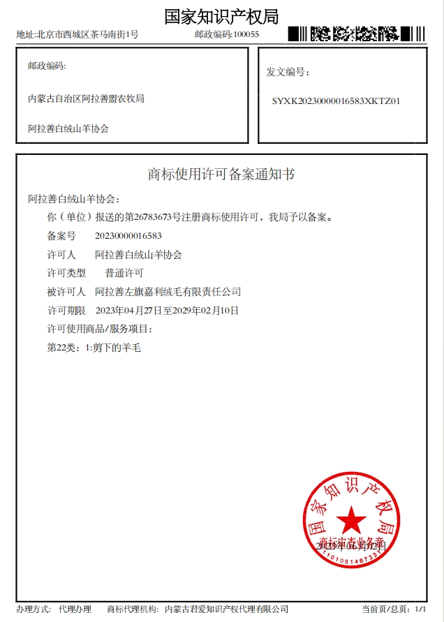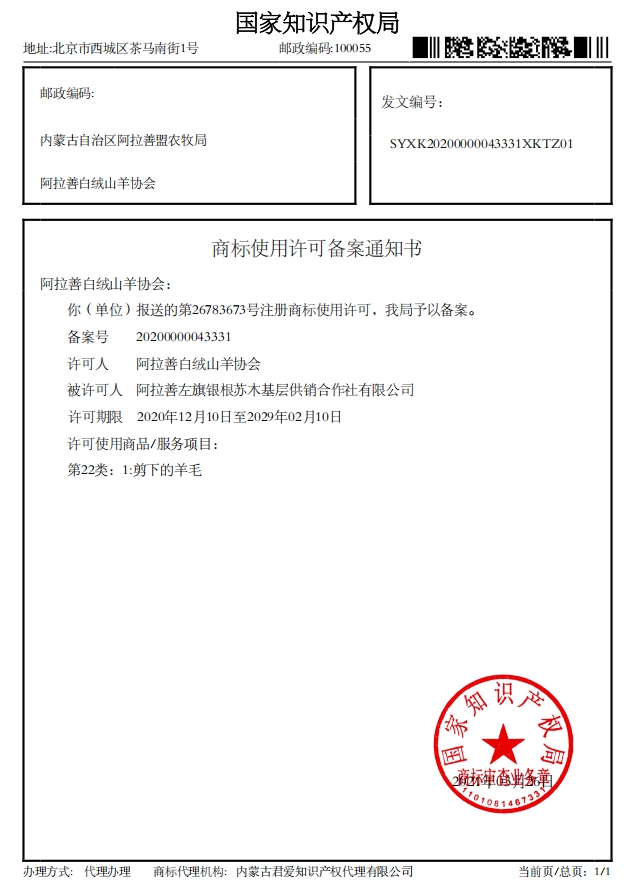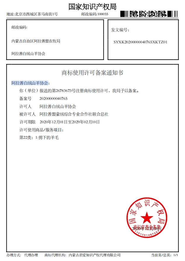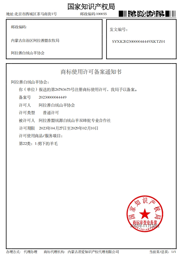 阿拉善白絨山羊協(xié)會已收到國家知識產權局下發(fā)的4項商標使用許可備案通知書