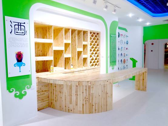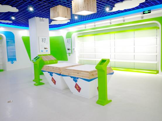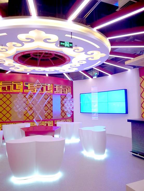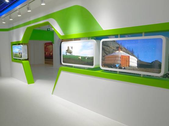 : 上海西郊國際內(nèi)蒙古館現(xiàn)場實景圖,現(xiàn)場分為展示區(qū)和體驗區(qū),展示區(qū)以產(chǎn)品展示銷售為主,現(xiàn)代科技結(jié)合時尚展廳設(shè)計風(fēng)格,藍(lán)綠白相結(jié)合,映襯藍(lán)天、白云、草原;體驗區(qū)突出體驗品嘗、商務(wù)洽談功能,以現(xiàn)代蒙古包造型設(shè)計,突出民族氣息,展現(xiàn)內(nèi)蒙古特色。