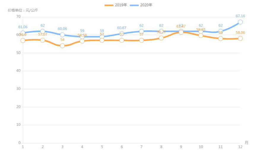 對內(nèi)蒙古幾大農(nóng)貿(mào)批發(fā)市場羊肉價(jià)進(jìn)行匯總分析得出:呼和浩特市內(nèi)蒙古美通農(nóng)產(chǎn)品批發(fā)市場羊肉最高價(jià)格出現(xiàn)在2020年11月68元/公斤,最低價(jià)格出現(xiàn)在2019年4月52元/公斤。呼和浩特市東瓦窯批發(fā)市場羊肉最高價(jià)格出現(xiàn)在2020年12月73.38元/公斤,最低價(jià)格出現(xiàn)在2019年5月61.08元/公斤。包頭市友誼蔬菜批發(fā)市場羊肉最高價(jià)格出現(xiàn)在2020年12月67.16元/公斤,最低價(jià)格出現(xiàn)在2019年3月54元/公斤。內(nèi)蒙古赤峰西城市場羊肉最高價(jià)格出現(xiàn)在2019年9月75.52元/公斤,最低價(jià)格出現(xiàn)在2019年3月56.97元/公斤。羊肉價(jià)格和去年同期相比整體上漲,漲幅基本在每公斤5-15元左右。