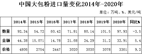 據(jù)中國海關統(tǒng)計,2020年進口大包粉97.93萬噸,同比-3.5%,進口額32.91億美元,同比+5.4%,均價3361美元/噸,同比+9.2%,主要來自新西蘭占71%、歐盟占12.7%、澳大利亞占7.9%。