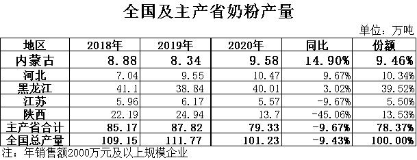 奶粉:根據(jù)國家統(tǒng)計局數(shù)據(jù),2020年全國奶粉產量101.23萬噸,同比下降9.43%,其中黑龍江產量40.01萬噸,同比增長3.02%,占總產量的39.52%,位居全國第一位;內蒙古產量9.58萬噸,同比增長14.90%,占總產量的9.46%,位居全國第四位。